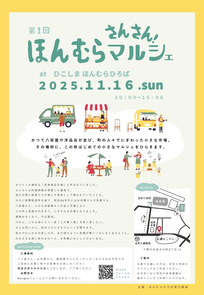 11/16(日)に「ほんむらさんさんマルシェ」を彦島本村町の”ひこしまほんむらひろば”にて開催します。