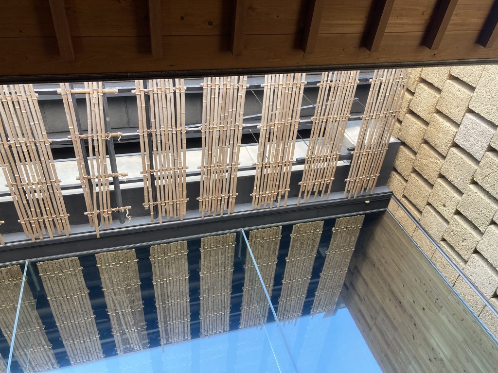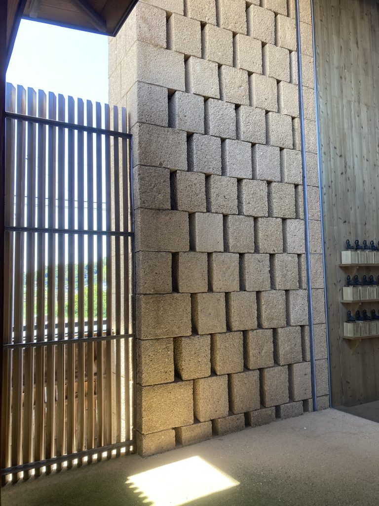 建物の両側面は版築グロックが積み上げたものが壁となっていて前面側の5枚程度はスリットが入ってます。すべてにスリットを入れるのではなく、前側の5枚だけ入れるスリットで動きが生まれ軽くなっているように感じます。